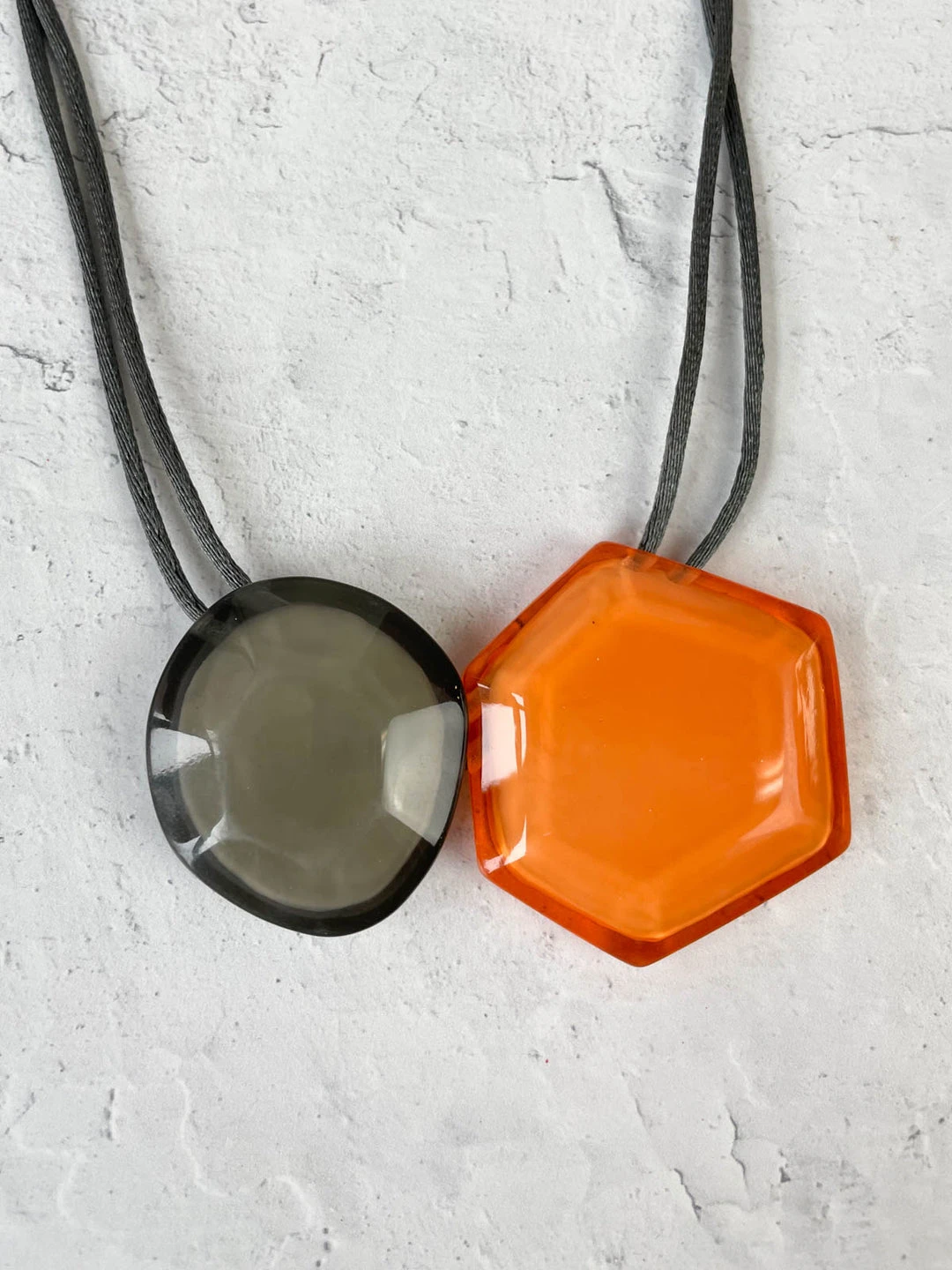 Part of Zsiska’s “Playa” collection, this adjustable necklace features two colored beads in faceted geometric shapes. The high shine resin stands out with juicy translucent color layered over a cream base. Coordinating grey fabric cord has adjustable pulls to adjust the length, as desired.