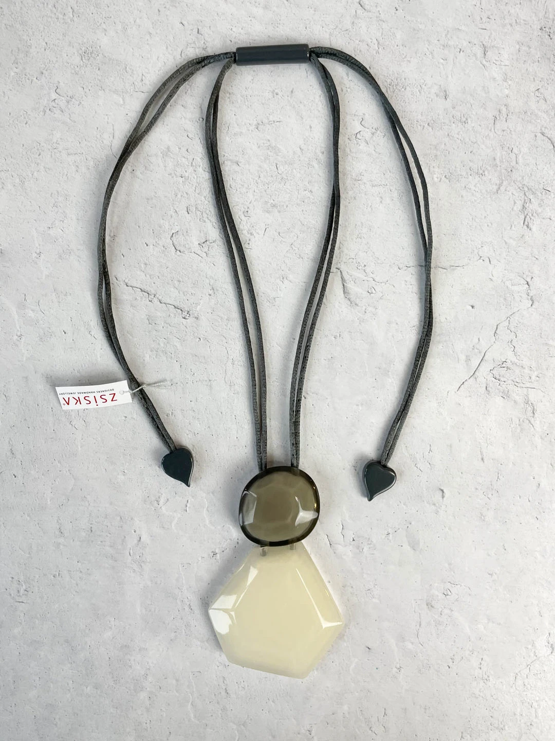 Part of Zsiska’s “Playa” collection, this adjustable necklace features a pendant of two colored beads in faceted geometric shapes. The high shine resin stands out with juicy translucent color layered over a cream base. Coordinating grey fabric cord has adjustable pulls to adjust the length, as desired.