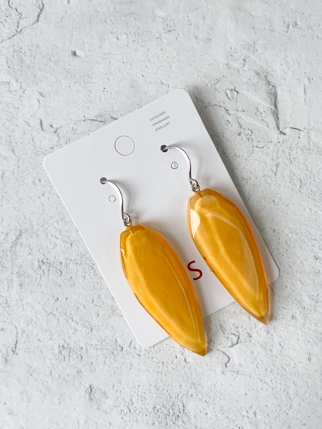 Part of Zsiska’s “Playa” collection, these chic drop earrings show off a faceted geometric shapes hanging from silver tone ear hooks. The high shine resin stands out with juicy translucent color layered over a cream base.