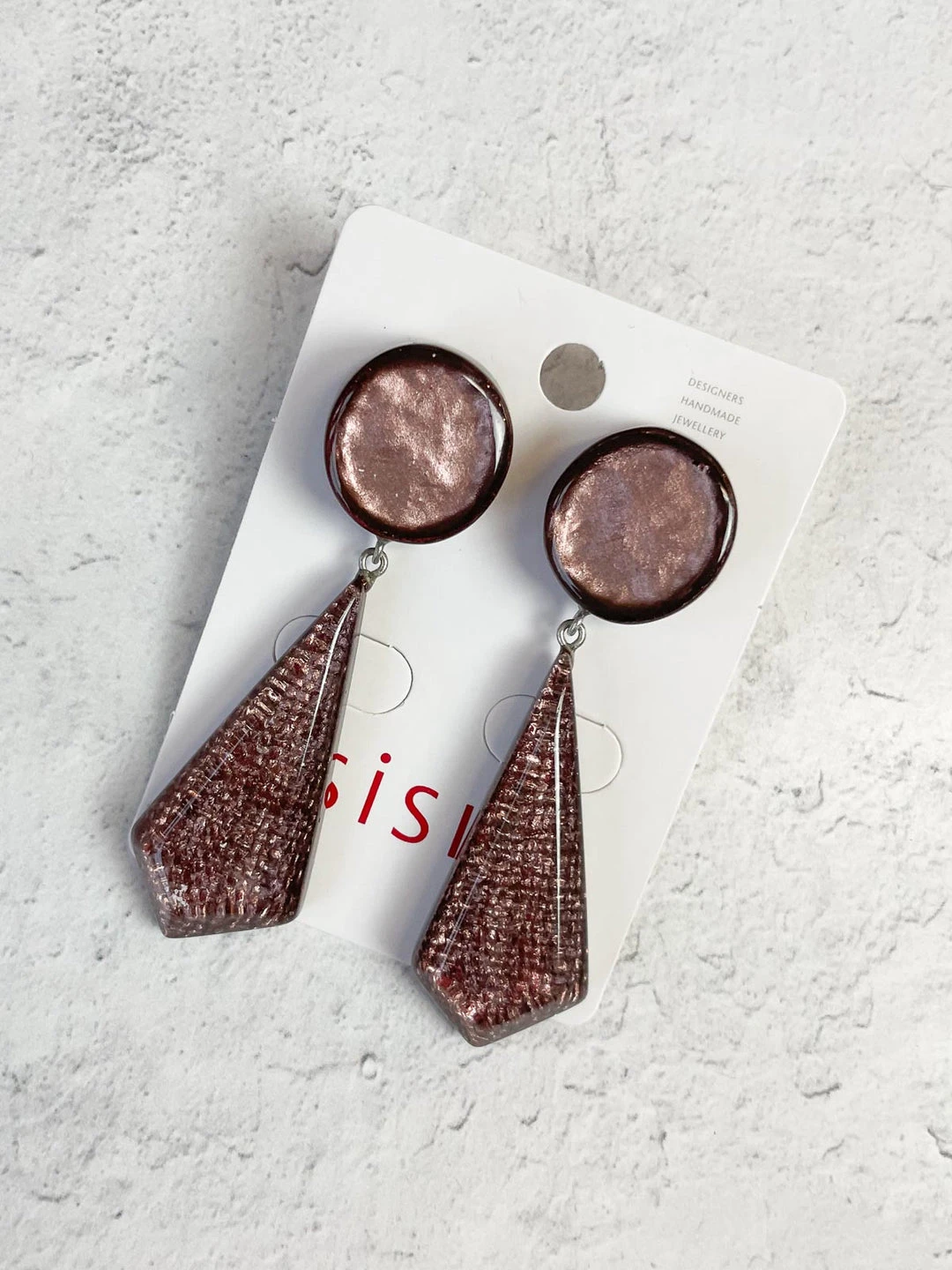 From Zsiska’s “Raquel” collection, these post style drop earrings features a textured geometric drop hanging from a round pearlescent stud, both in high shine resin.