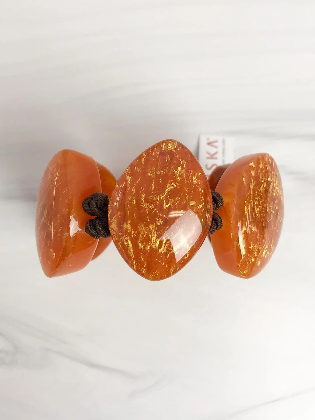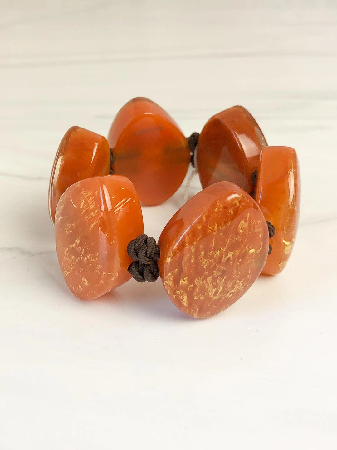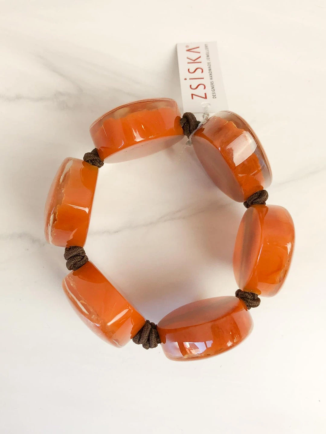 Zsiska’s “Rhea” collection features layered resin with textured gold accent. This stretch bracelet features almond shaped pieces on coordinating knotted elastic cord.