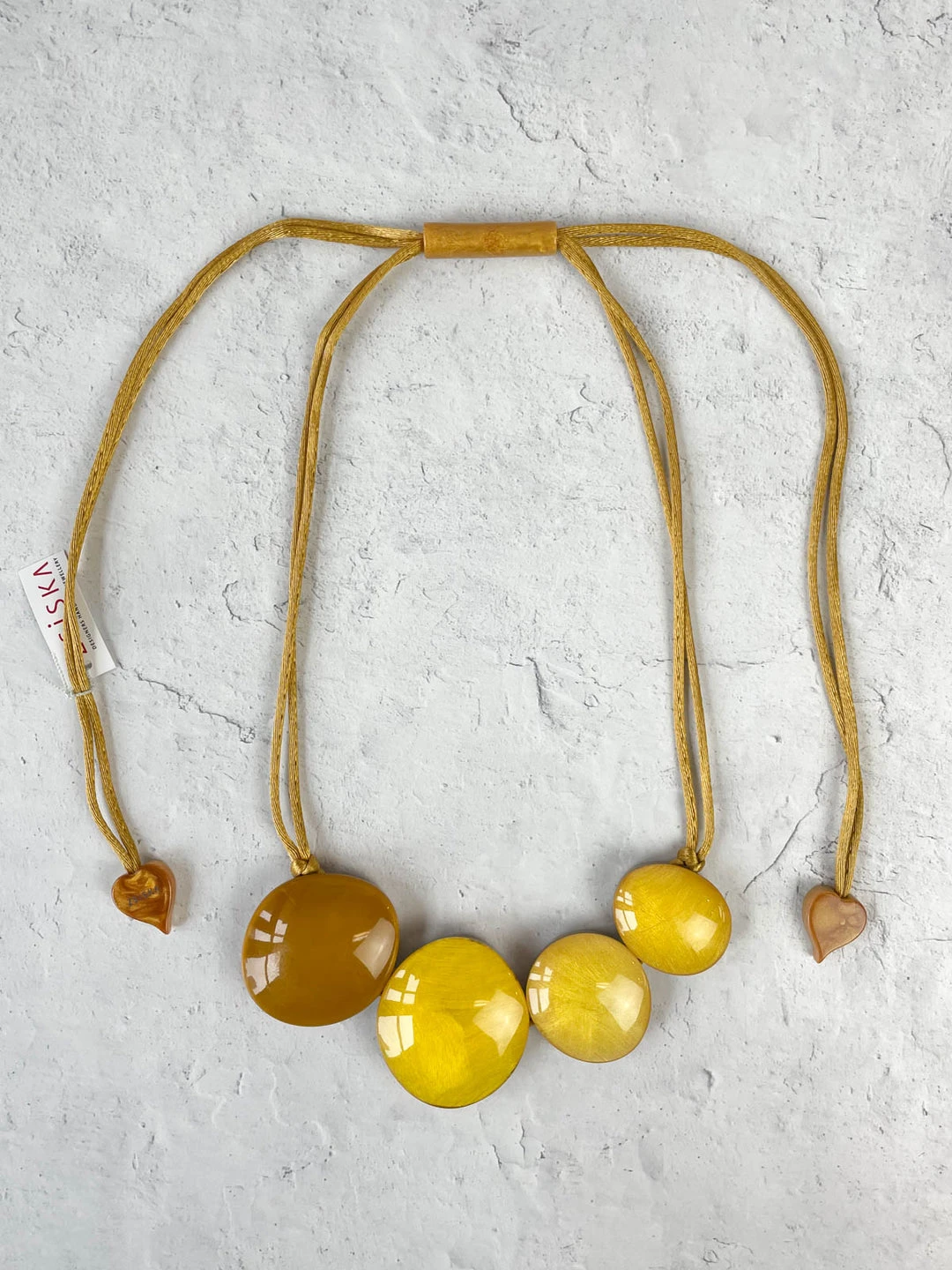 Zsiska’s “Sophia” collection features a chic mix of colored textured resin with a shiny domed overlay. This adjustable necklace features four beads on coordinating fabric cord, with adjustable pulls.