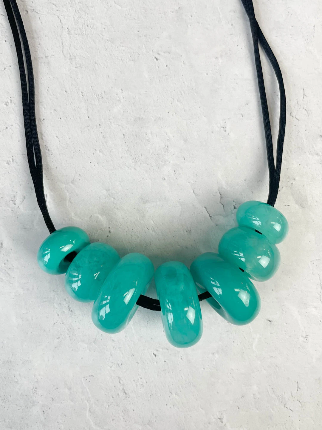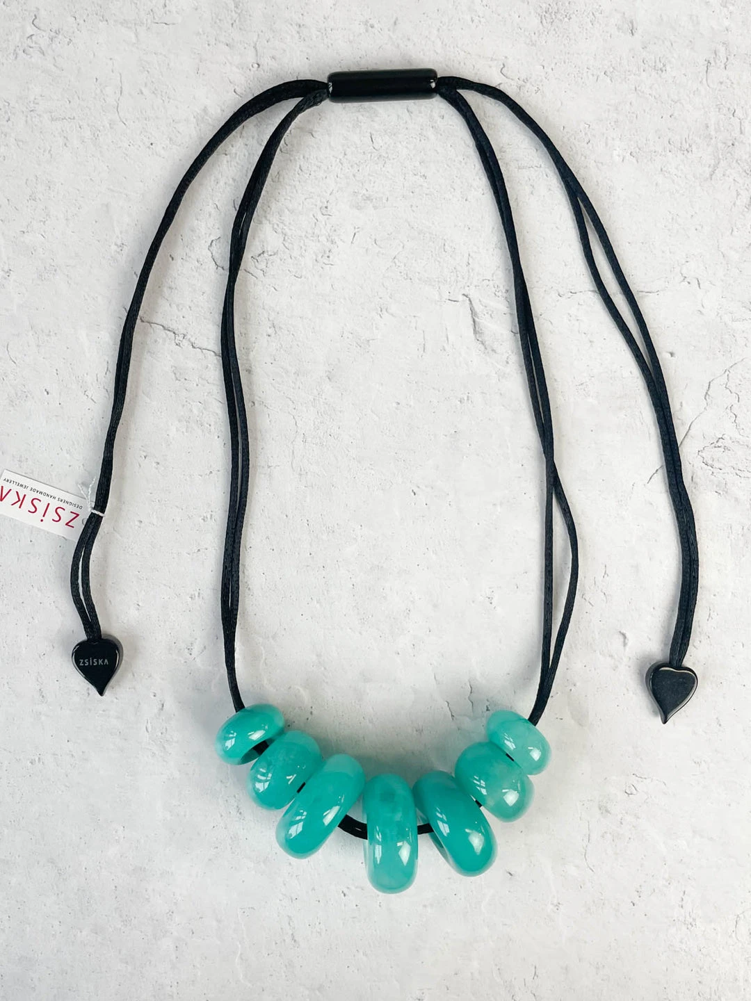 The “Whimsical” collection from Zsiska shows off donut shaped shiny marbled beads in a rainbow of brights. This necklace features various sized beads on black cord with an adjustable pull.