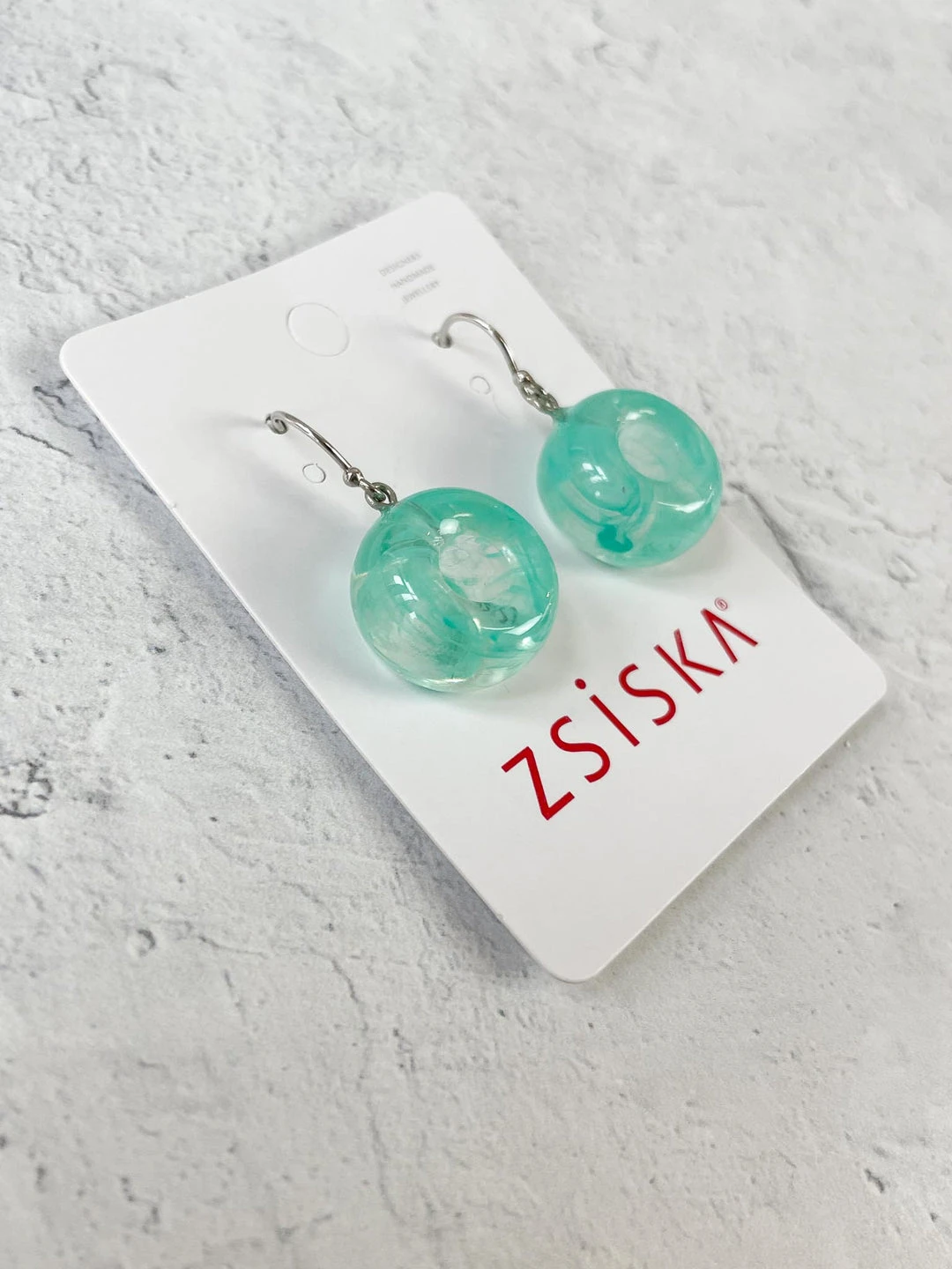 The “Whimsical” collection from Zsiska shows off donut shaped shiny marbled beads in a rainbow of brights. These earrings feature a small donut drop on ear wire.