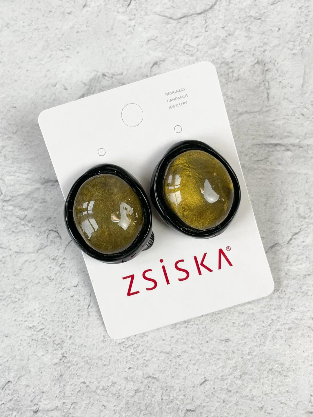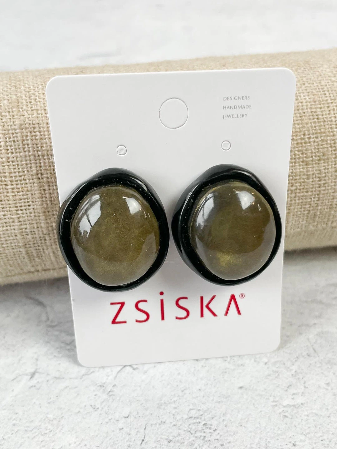 From Zsiska’s “Glam” collection, come these clip-on earrings that feature a slight iridescent pebble shaped resin center framed in black.