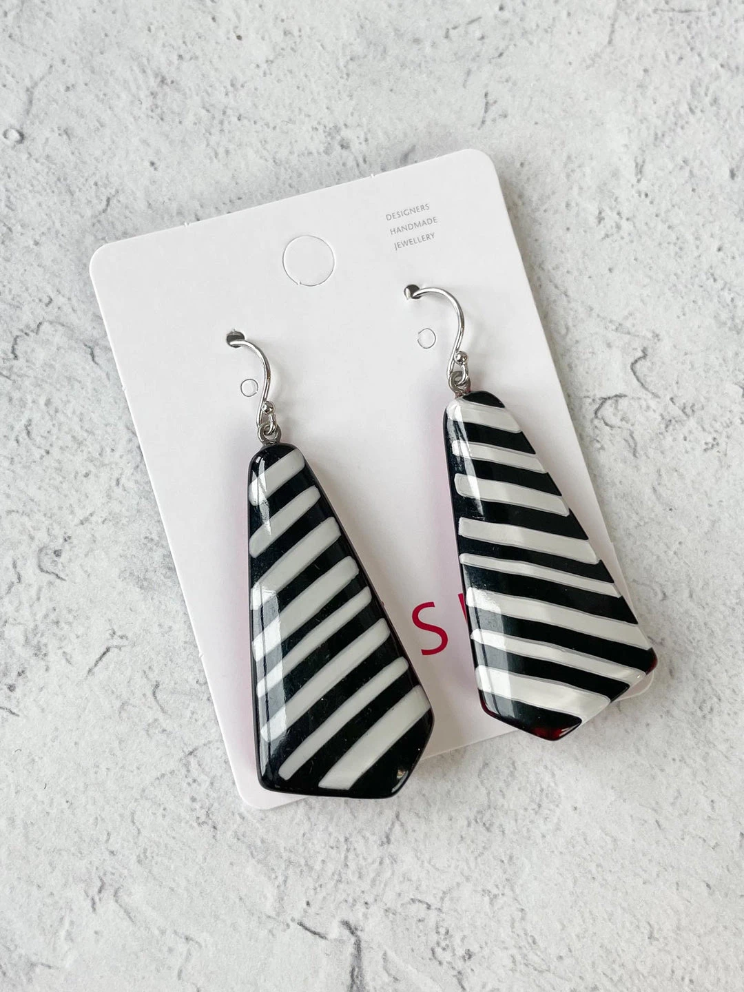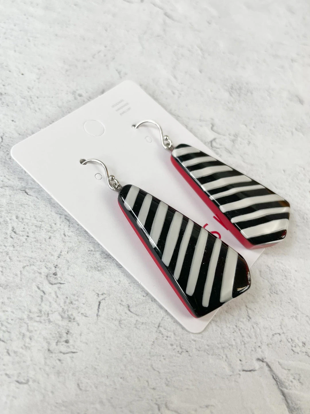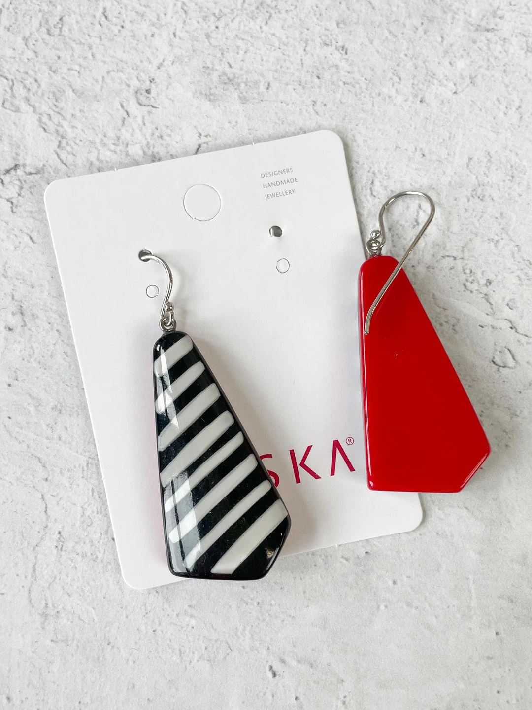 Zsiska’s “Olivia” collection stands out with a mix of stripes and primary colors. These wire earrings feature geometric drops with a striped front and solid back, giving a little peek of color on the sides.