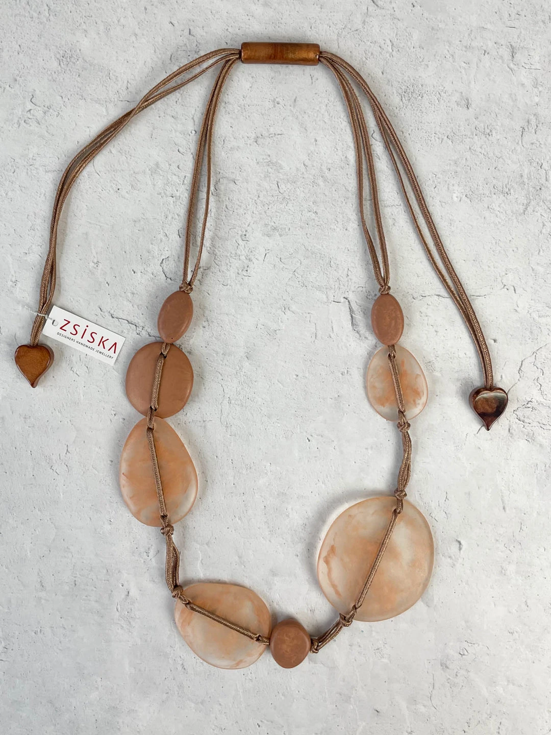 Zsiska’s “Sabaai” collection features a sophisticated mix of translucent marbled resin with coordinginat solid resin, both with a soft matte finish. This adjustable necklace features eight pebbled beads knotted on fabric cord, with adjustable pulls.